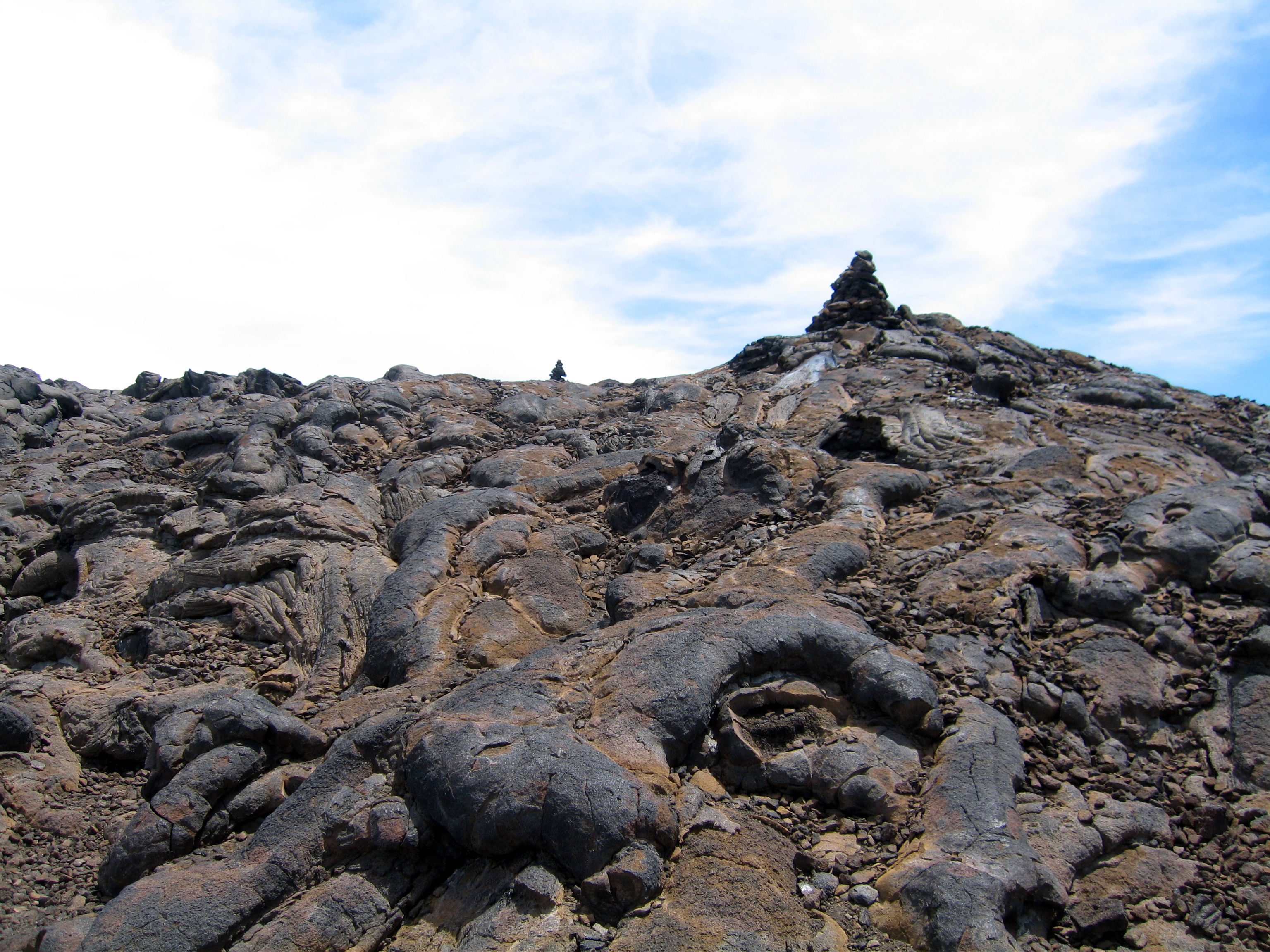 The "trail" up the mountain isn't really one. You can't really carve a trail through solid rock. So instead you have to pick your way across the harder rock, avoiding the crumbling rock. You do this by picking your way from cairn to cairn, where someone has pointed out the easiest way between two points. You have to stop at each cairn to find the next one and then head toward it.